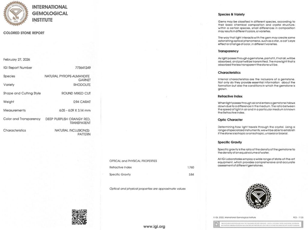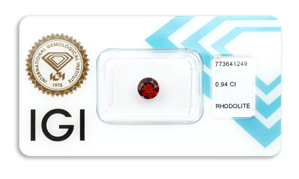 rhodolit 0.94ct deep purplish orangy red s IGI certifikátem