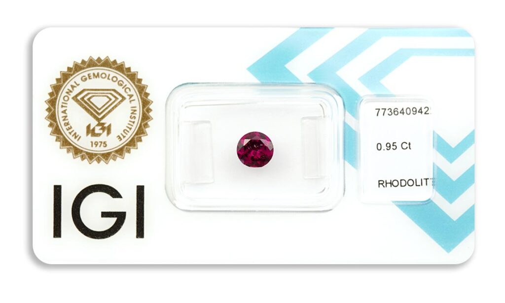 rhodolit 0.95ct deep reddish purple s IGI certifikátem