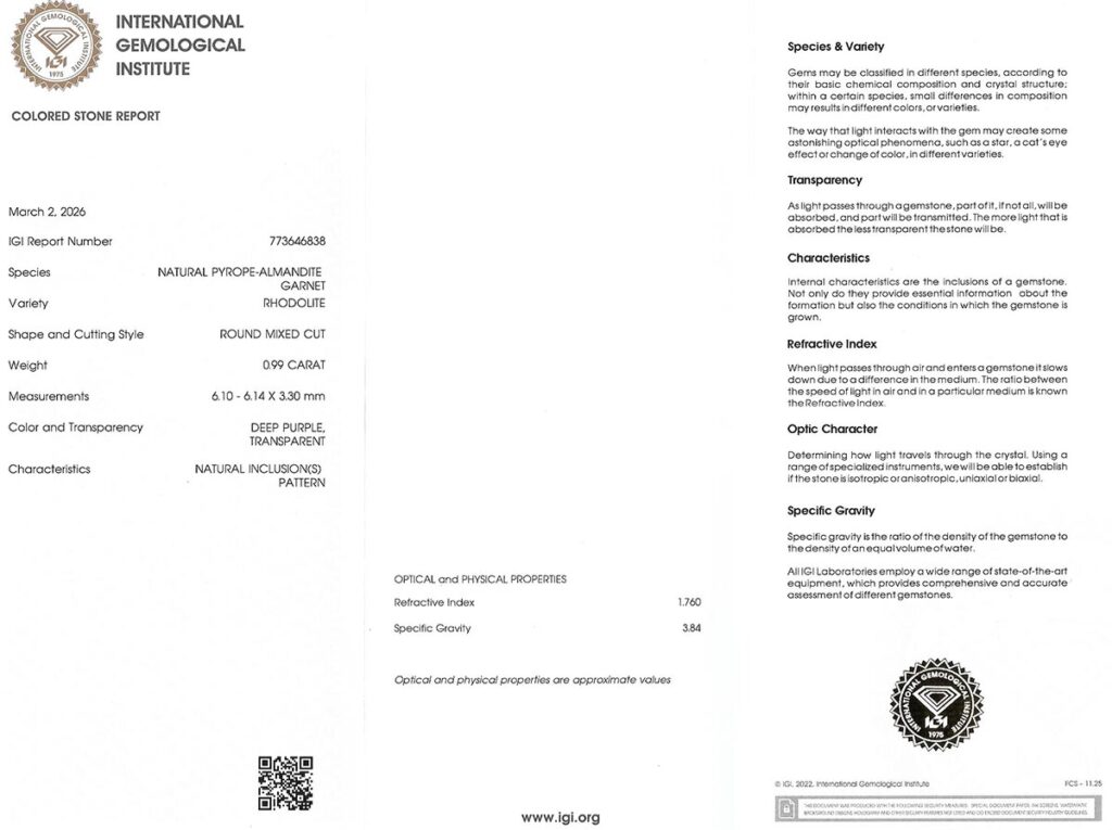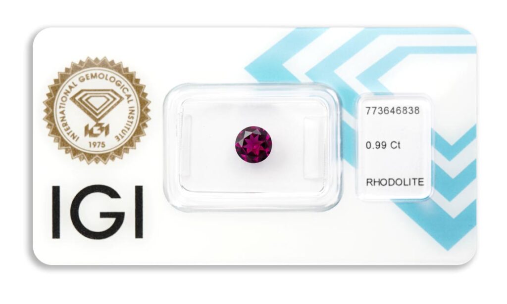 rhodolit 0.99ct deep purple s IGI certifikátem
