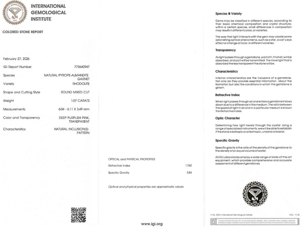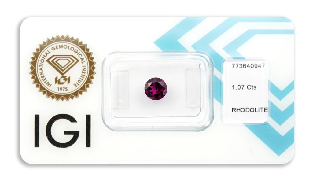 rhodolit 1.07ct deep purplish pink s IGI certifikátem