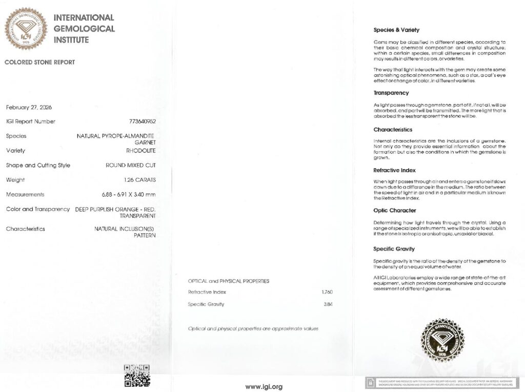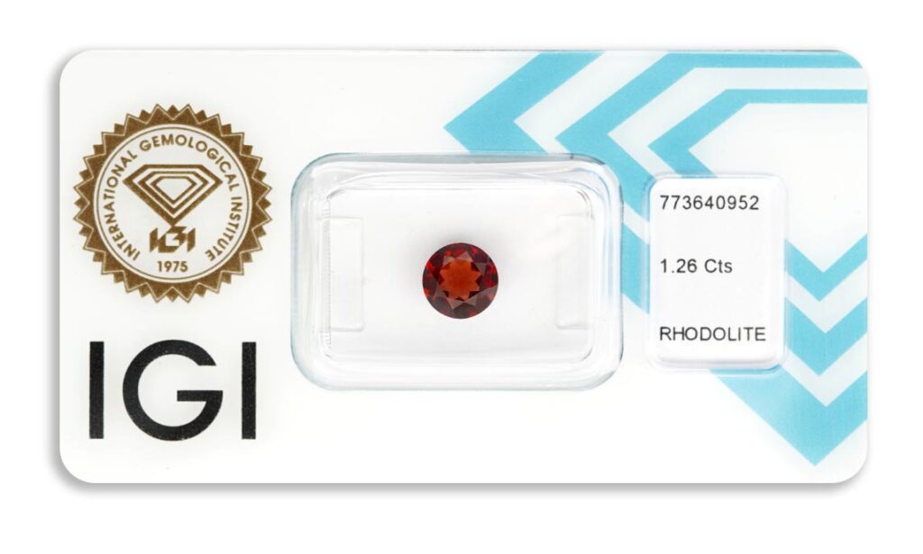 rhodolit 1.26ct deep purplish orange – red s IGI certifikátem