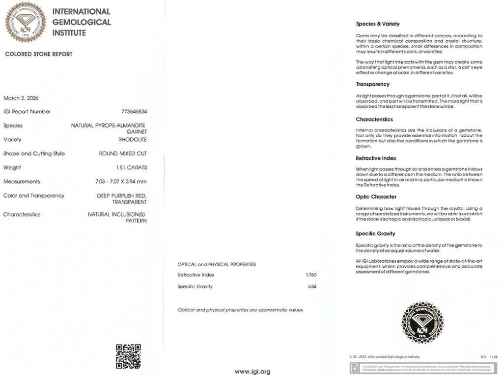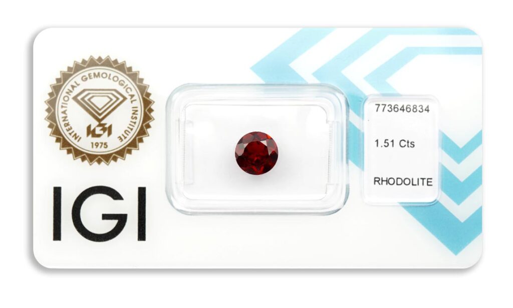 rhodolit 1.51ct deep purplish red s IGI certifikátem