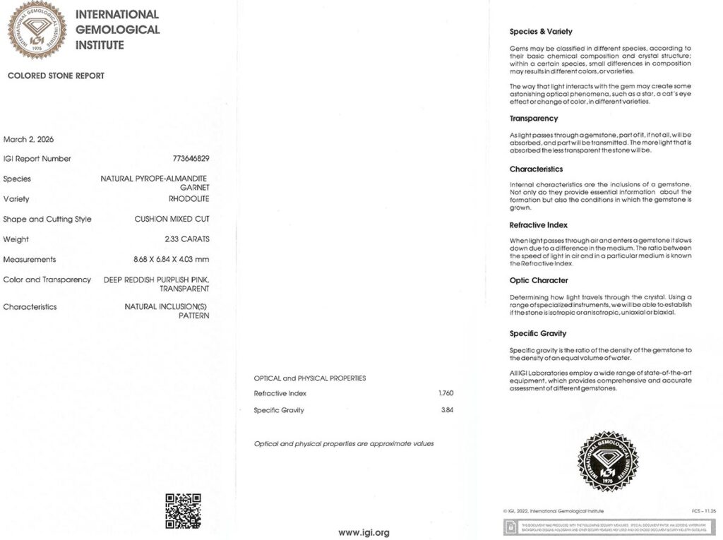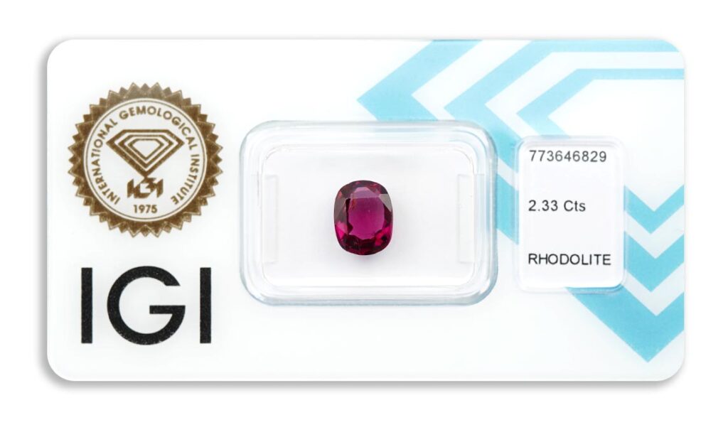 rhodolit 2.33ct deep reddish purplish pink s IGI certifikátem