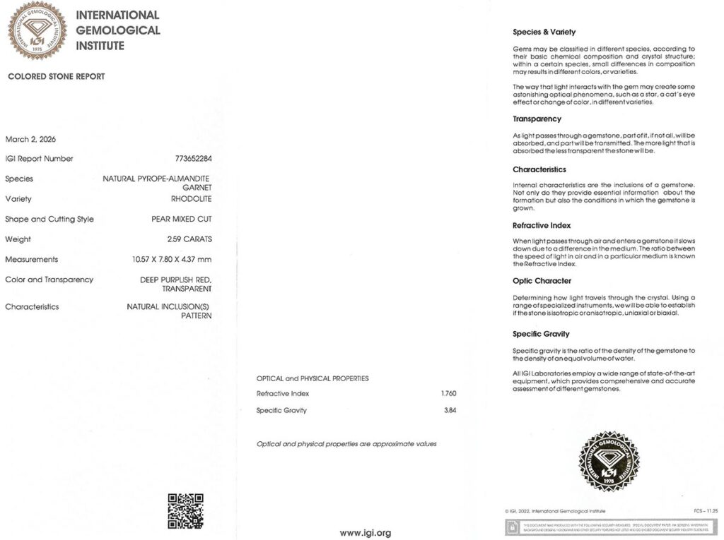 rhodolit 2.59ct deep purplish red s IGI certifikátem