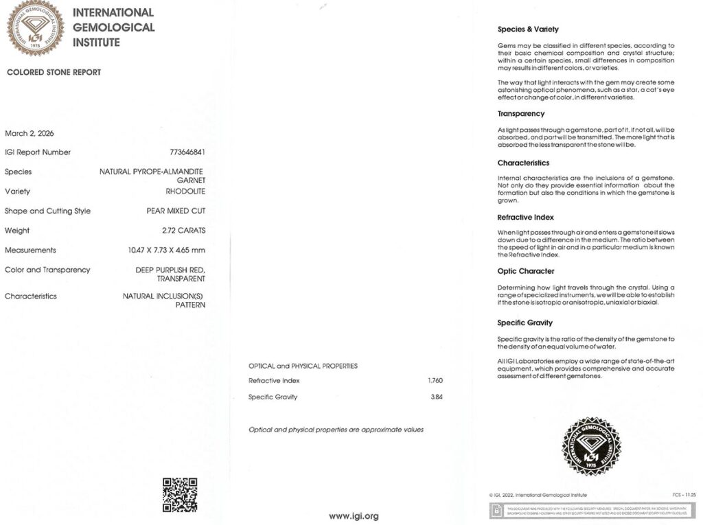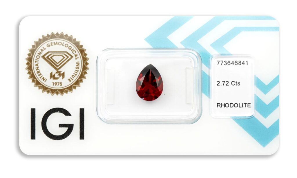 rhodolit 2.72ct deep purplish red s IGI certifikátem