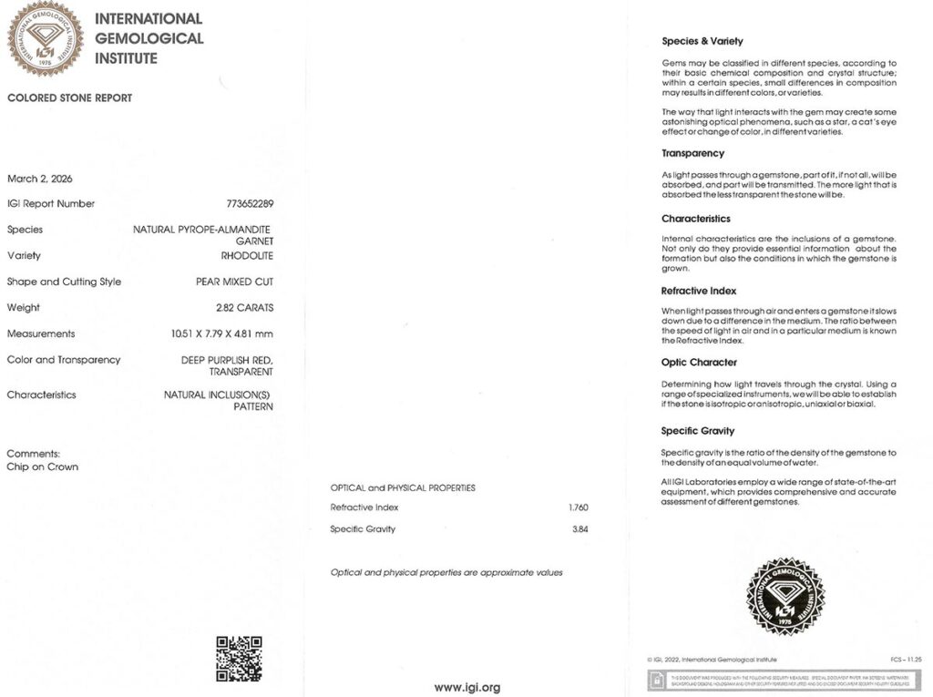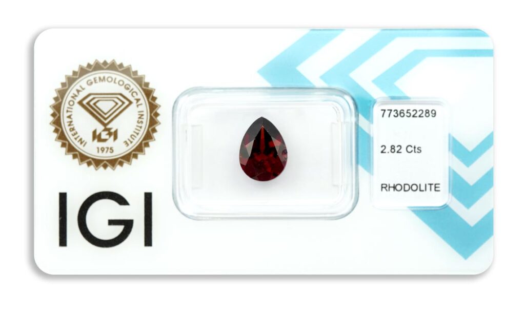 rhodolit 2.82ct deep purplish red s IGI certifikátem