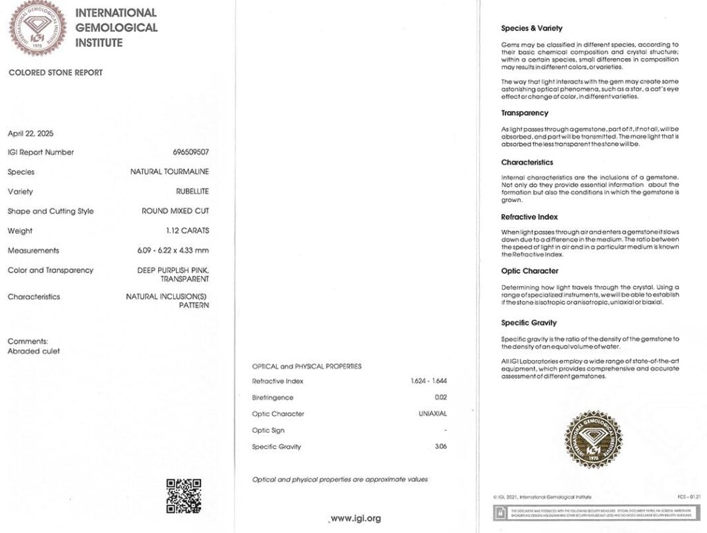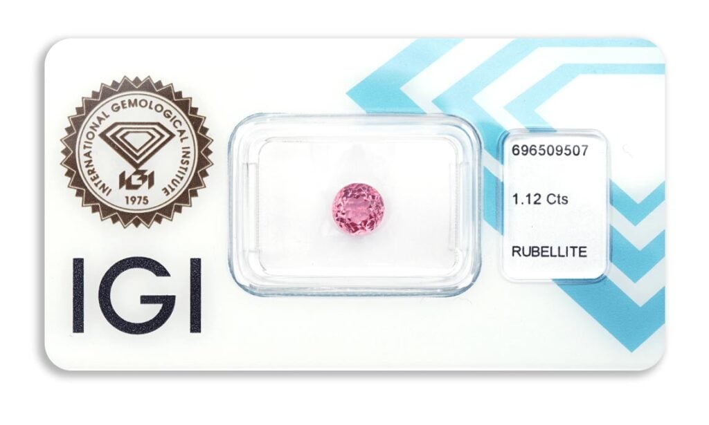 rubelit 1.12ct deep purplish pink s IGI certifikátem
