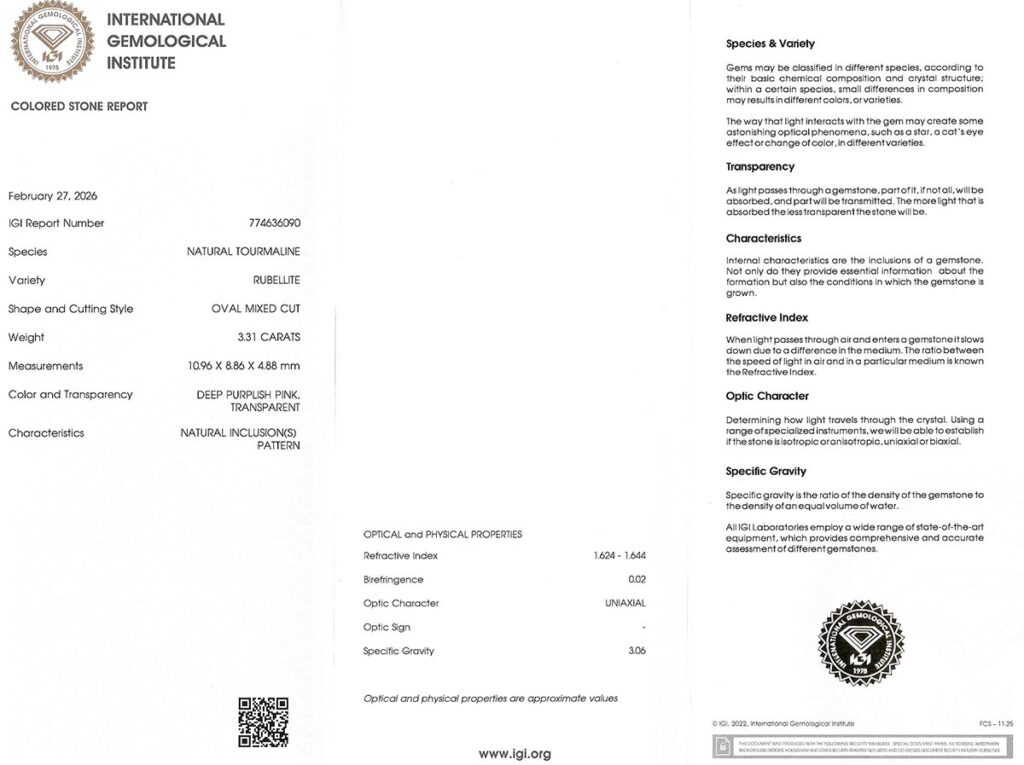 rubelit 3.31ct deep purplish pink s IGI certifikátem