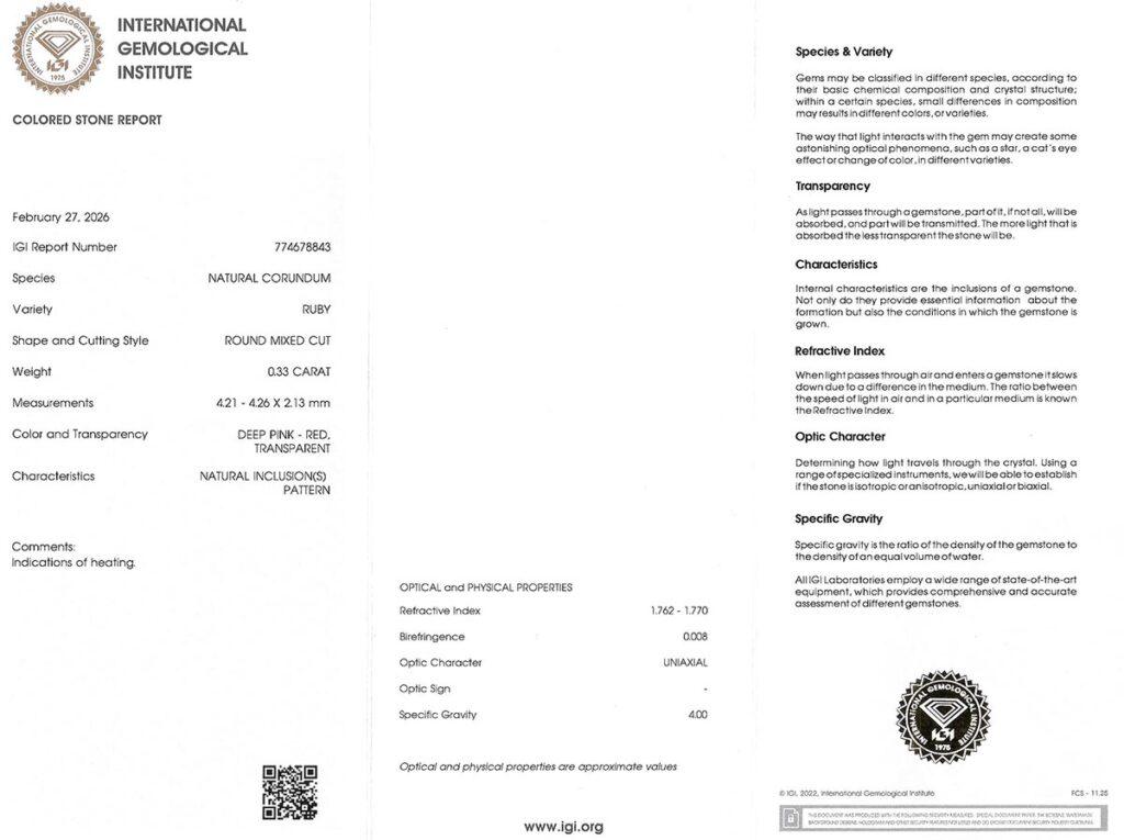 Kámen je včetně mezinárodně uznávaného certifikátu IGI a je zataven do ochranného pouzdra. Rubín byl tepelně upraven (jedná se o běžnou úpravu rubínů).