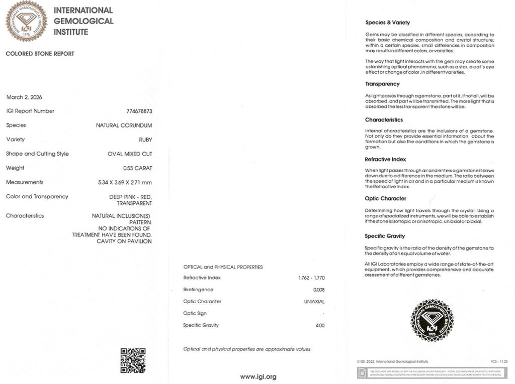 Kámen je včetně mezinárodně uznávaného certifikátu IGI a je zataven do ochranného pouzdra. Rubín nebyl tepelně upraven.