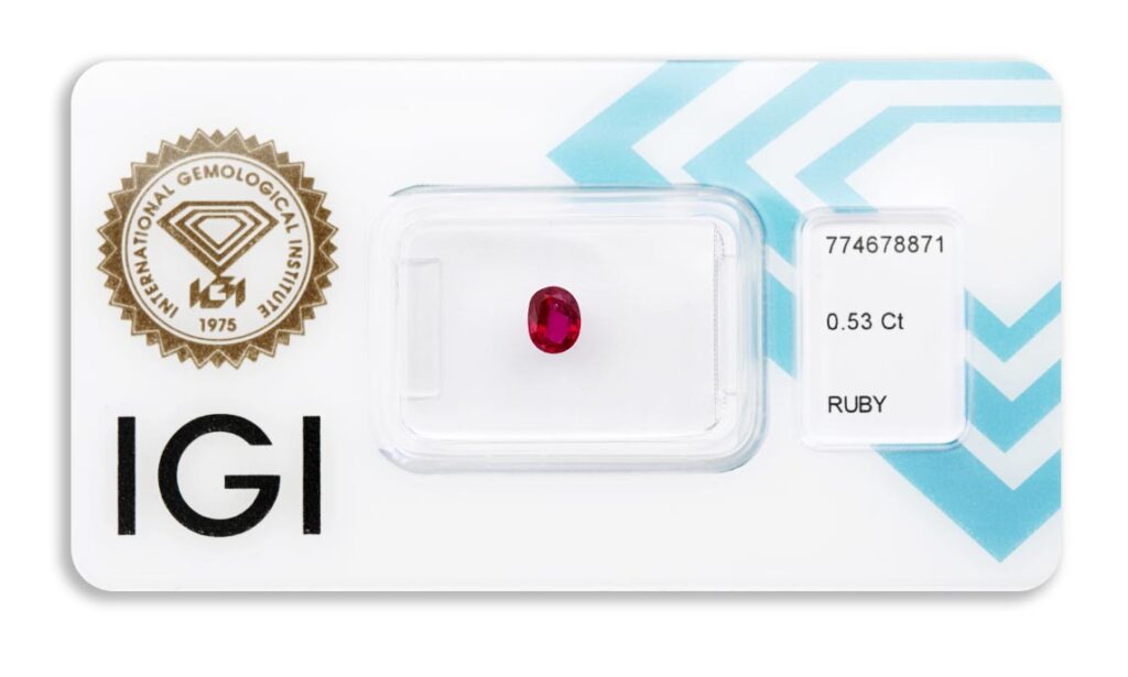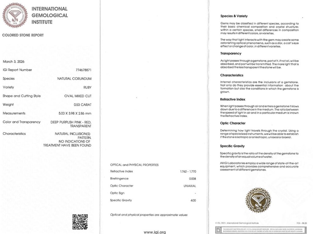 Kámen je včetně mezinárodně uznávaného certifikátu IGI a je zataven do ochranného pouzdra. Rubín nebyl tepelně upraven.