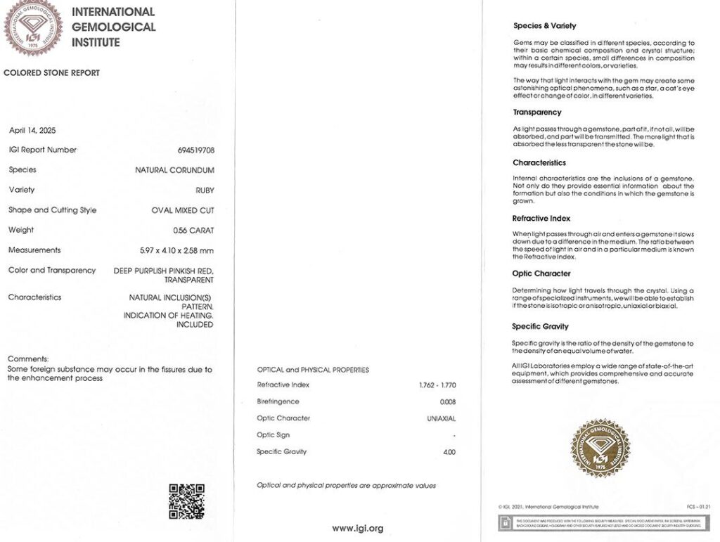 Kámen je včetně mezinárodně uznávaného certifikátu IGI a je zataven do ochranného pouzdra. Rubín byl tepelně upraven (jedná se o běžnou úpravu rubínů). Čistota rubínu byla dodatečně vylepšena.