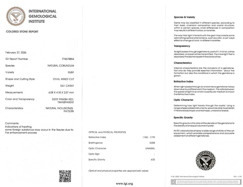 Kámen je včetně mezinárodně uznávaného certifikátu IGI a je zataven do ochranného pouzdra. Rubín byl tepelně upraven (jedná se o běžnou úpravu rubínů). Čistota rubínu byla dodatečně vylepšena.