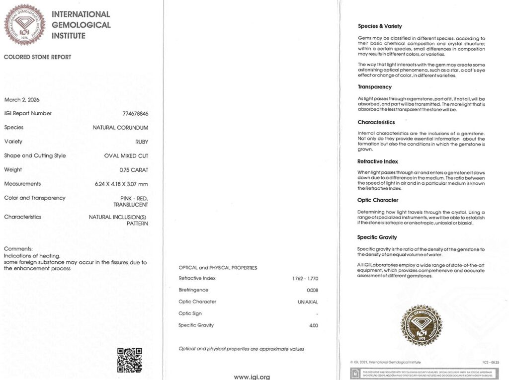 Kámen je včetně mezinárodně uznávaného certifikátu IGI a je zataven do ochranného pouzdra. Rubín byl tepelně upraven (jedná se o běžnou úpravu rubínů). Čistota rubínu byla dodatečně vylepšena.