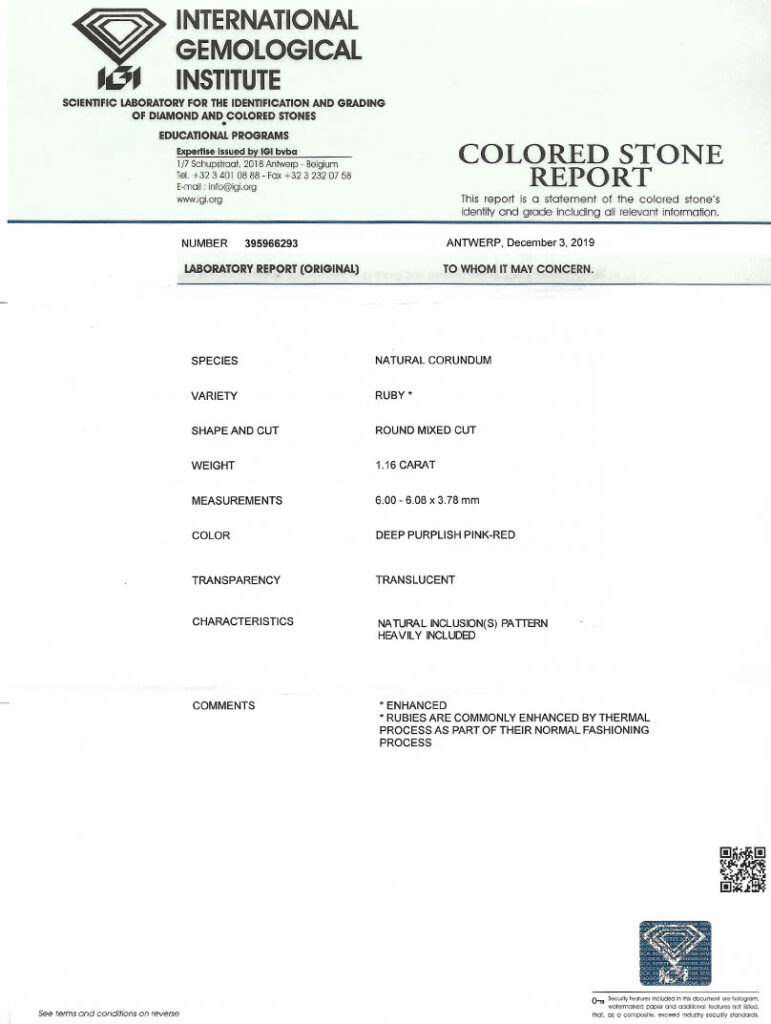 Kámen je včetně mezinárodně uznávaného certifikátu IGI a je zataven do ochranného pouzdra. Rubín byl tepelně upraven (jedná se o běžnou úpravu rubínů).