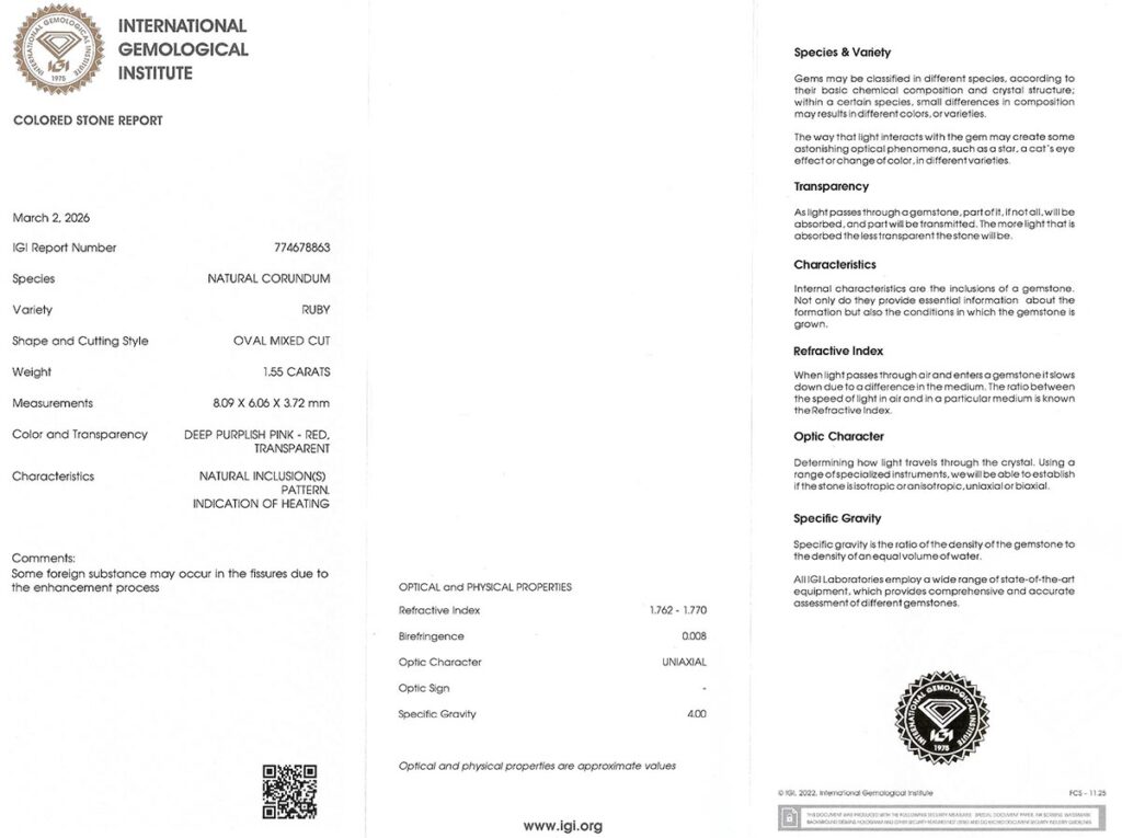 Kámen je včetně mezinárodně uznávaného certifikátu IGI a je zataven do ochranného pouzdra. Rubín byl tepelně upraven (jedná se o běžnou úpravu rubínů). Čistota rubínu byla dodatečně vylepšena.