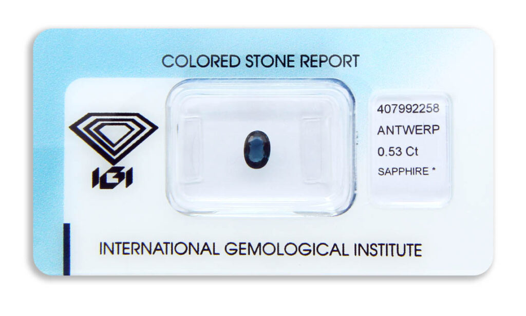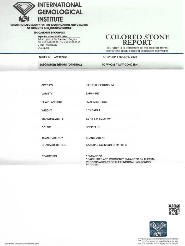 Kámen je včetně mezinárodně uznávaného certifikátu IGI a je zataven do ochranného pouzdra. Safír byl tepelně upraven (jedná se o běžnou úpravu).