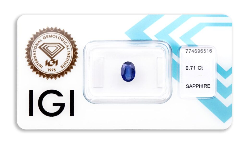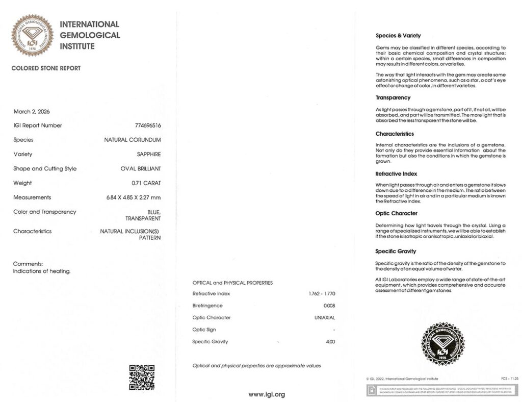 Kámen je včetně mezinárodně uznávaného certifikátu IGI a je zataven do ochranného pouzdra. Safír byl tepelně upraven (jedná se o běžnou úpravu).