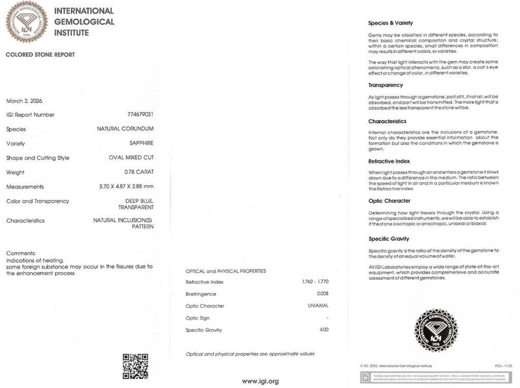Kámen je včetně mezinárodně uznávaného certifikátu IGI a je zataven do ochranného pouzdra. Safír byl tepelně upraven (jedná se o běžnou úpravu). Čistota safíru byla dodatečně vylepšena.