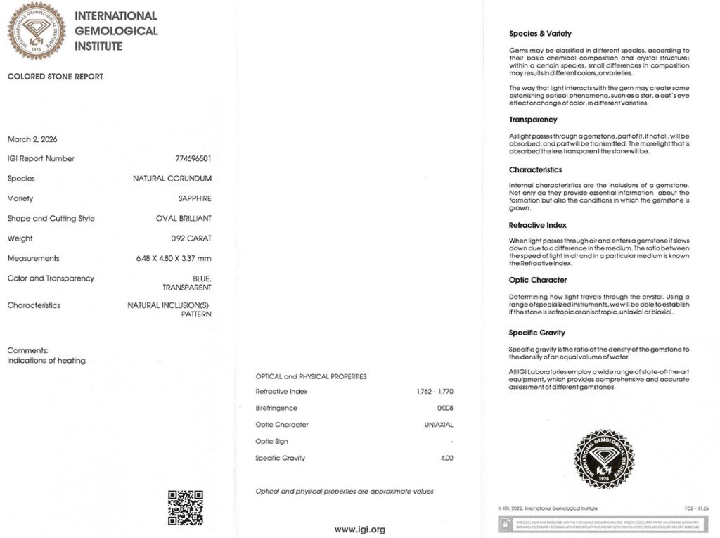 Kámen je včetně mezinárodně uznávaného certifikátu IGI a je zataven do ochranného pouzdra. Safír byl tepelně upraven (jedná se o běžnou úpravu).