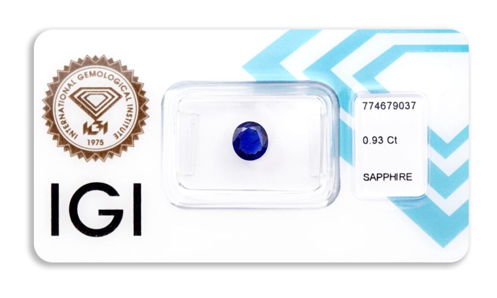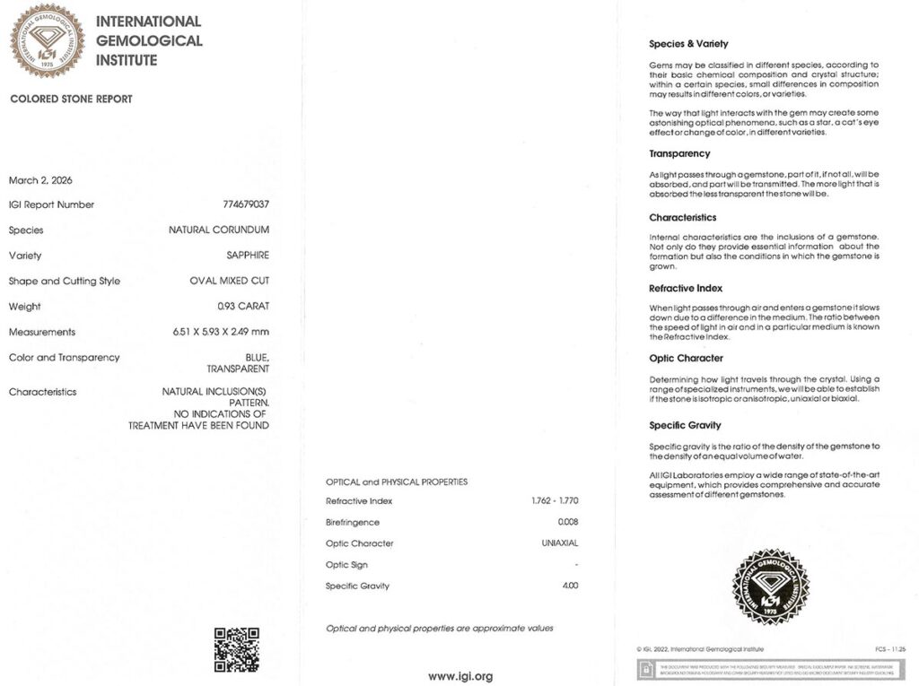 Kámen je včetně mezinárodně uznávaného certifikátu IGI a je zataven do ochranného pouzdra. Safír nebyl tepelně upraven.