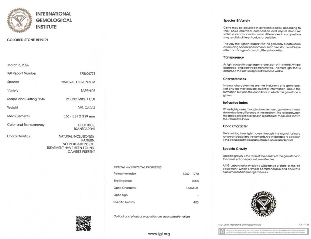 Kámen je včetně mezinárodně uznávaného certifikátu IGI a je zataven do ochranného pouzdra. Safír nebyl tepelně upraven.