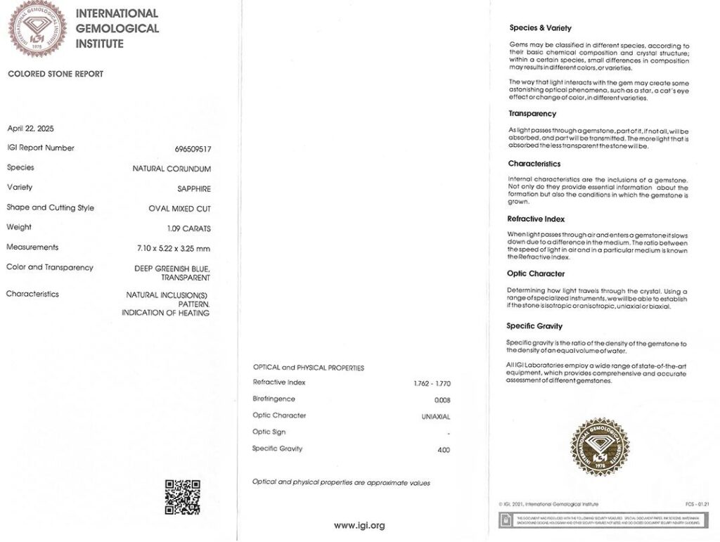 Kámen je včetně mezinárodně uznávaného certifikátu IGI a je zataven do ochranného pouzdra. Safír byl tepelně upraven (jedná se o běžnou úpravu).