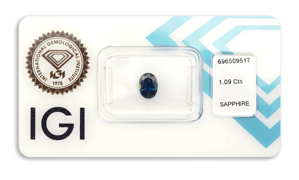 safír 1.09ct deep greenish blue s IGI certifikátem