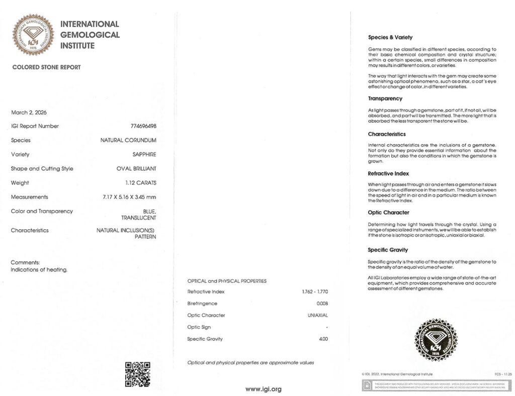 Kámen je včetně mezinárodně uznávaného certifikátu IGI a je zataven do ochranného pouzdra. Safír byl tepelně upraven (jedná se o běžnou úpravu).
