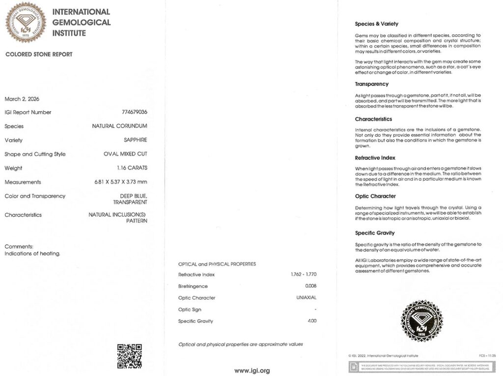 Kámen je včetně mezinárodně uznávaného certifikátu IGI a je zataven do ochranného pouzdra. Safír byl tepelně upraven (jedná se o běžnou úpravu).