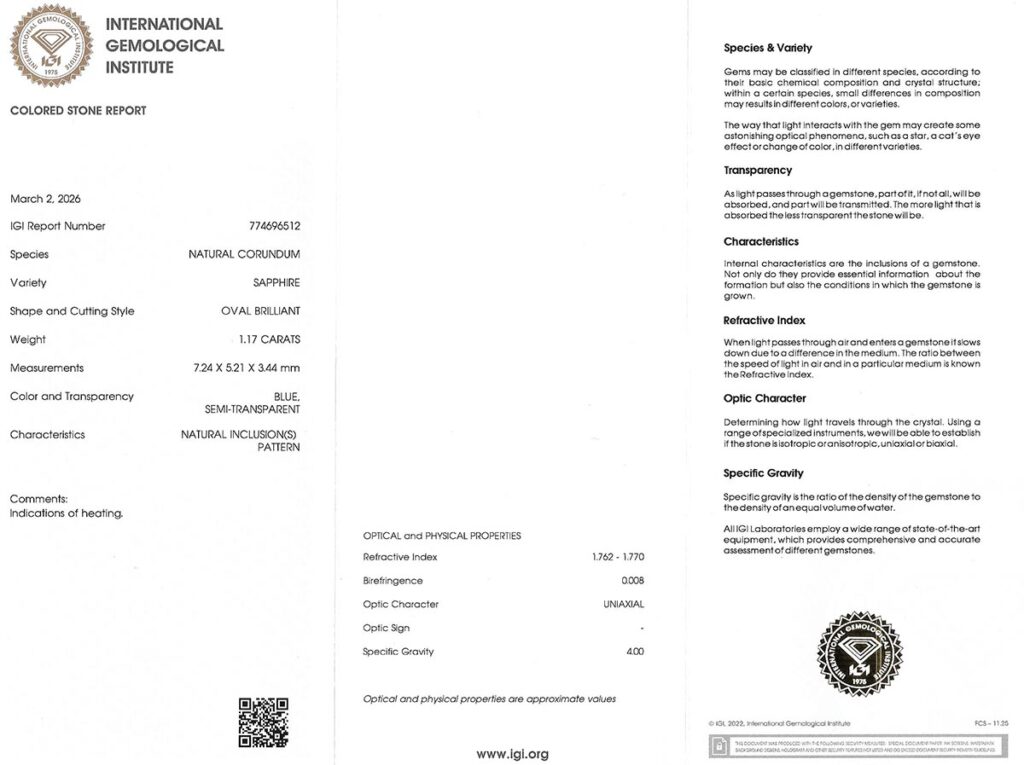 Kámen je včetně mezinárodně uznávaného certifikátu IGI a je zataven do ochranného pouzdra. Safír byl tepelně upraven (jedná se o běžnou úpravu).