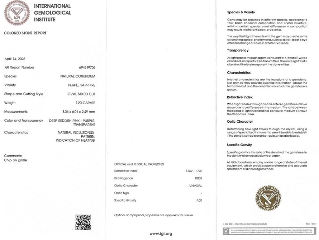 Kámen je včetně mezinárodně uznávaného certifikátu IGI a je zataven do ochranného pouzdra. Safír byl tepelně upraven (jedná se o běžnou úpravu).