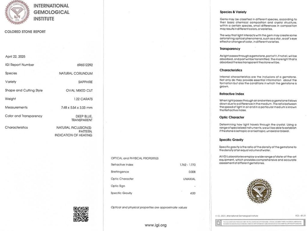 Kámen je včetně mezinárodně uznávaného certifikátu IGI a je zataven do ochranného pouzdra. Safír byl tepelně upraven (jedná se o běžnou úpravu).