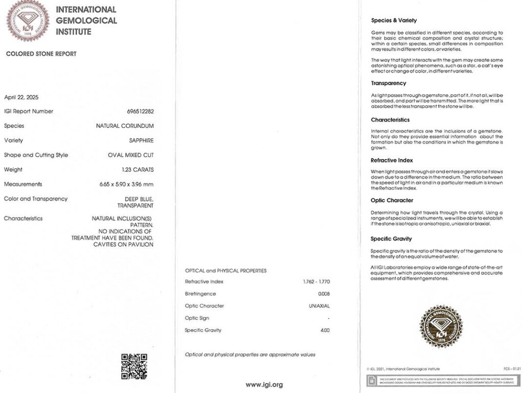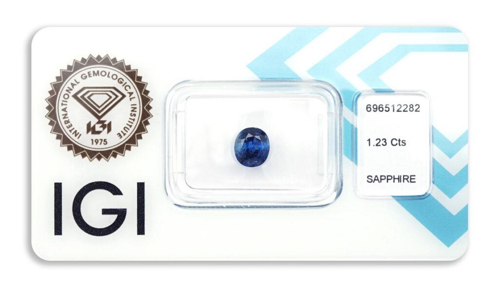 Kámen je včetně mezinárodně uznávaného certifikátu IGI a je zataven do ochranného pouzdra. Safír nebyl tepelně upraven.