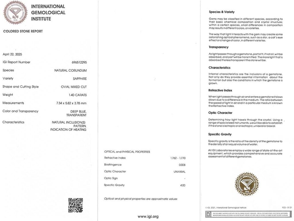 Kámen je včetně mezinárodně uznávaného certifikátu IGI a je zataven do ochranného pouzdra. Safír byl tepelně upraven (jedná se o běžnou úpravu).