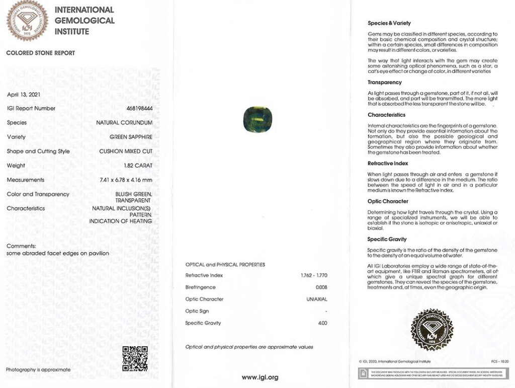 Kámen je včetně mezinárodně uznávaného certifikátu IGI a je zataven do ochranného pouzdra. Safír byl tepelně upraven (jedná se o běžnou úpravu).