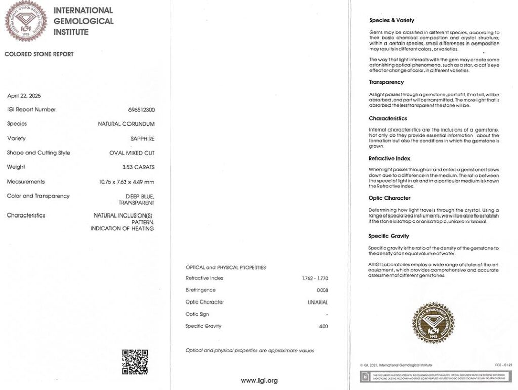 Kámen je včetně mezinárodně uznávaného certifikátu IGI a je zataven do ochranného pouzdra. Safír byl tepelně upraven (jedná se o běžnou úpravu).