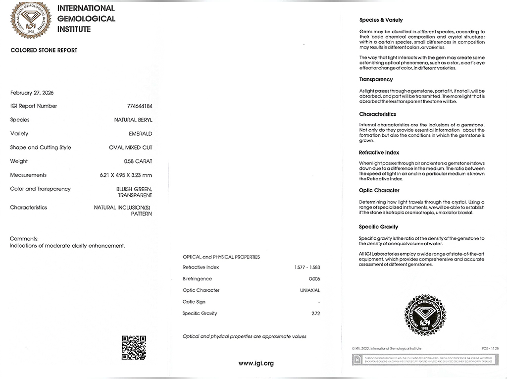 Kámen je včetně mezinárodně uznávaného certifikátu IGI a je zataven do ochranného pouzdra. Průhlednost smaragdu byla upravena bezbarvým olejem (jedná se o běžnou úpravu).