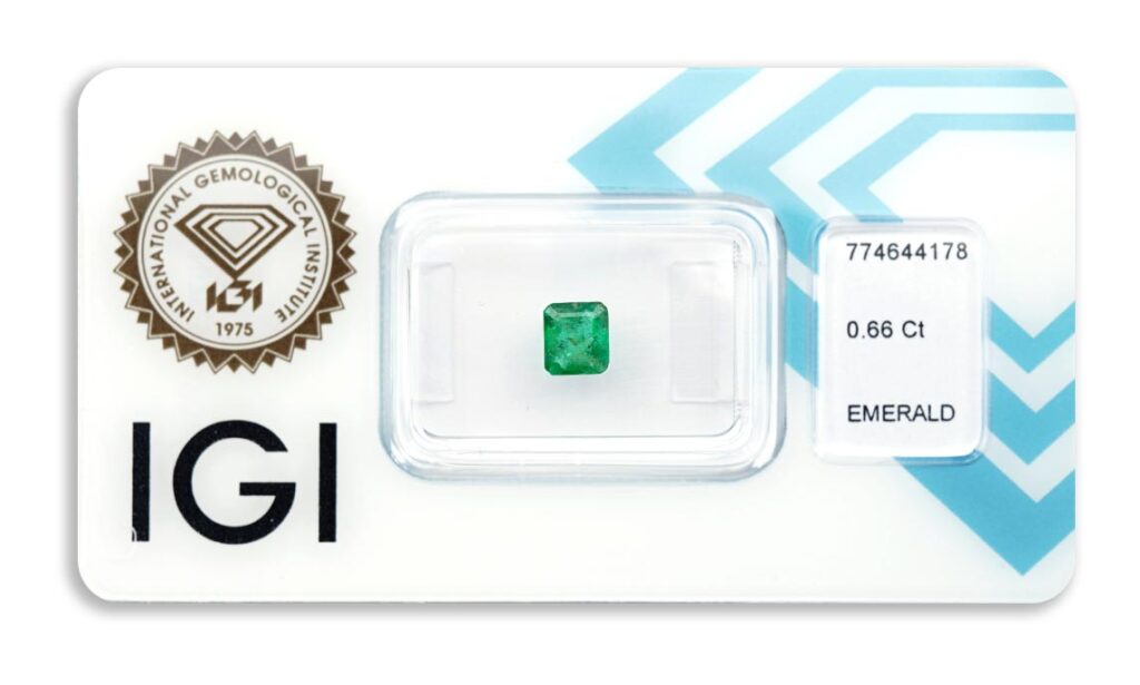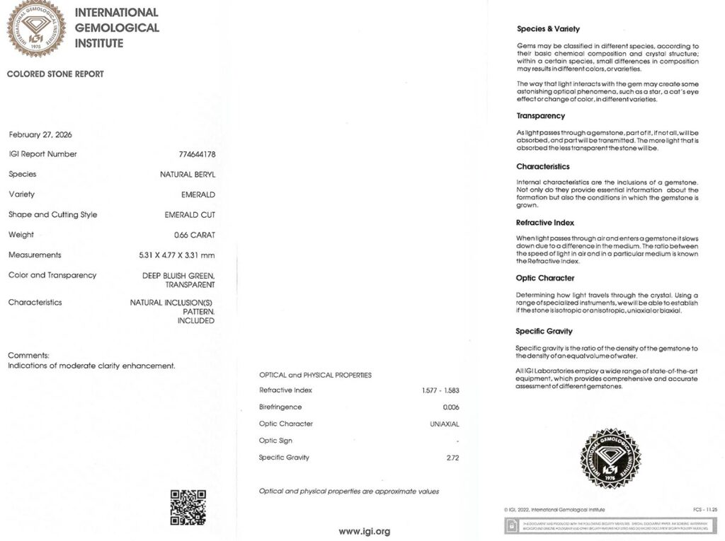 Kámen je včetně mezinárodně uznávaného certifikátu IGI a je zataven do ochranného pouzdra. Průhlednost smaragdu byla upravena bezbarvým olejem (jedná se o běžnou úpravu).