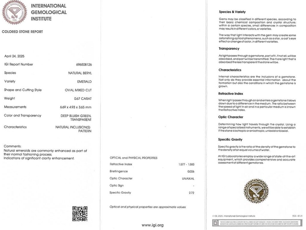 Kámen je včetně mezinárodně uznávaného certifikátu IGI a je zataven do ochranného pouzdra. Průhlednost smaragdu byla upravena bezbarvým olejem (jedná se o běžnou úpravu).