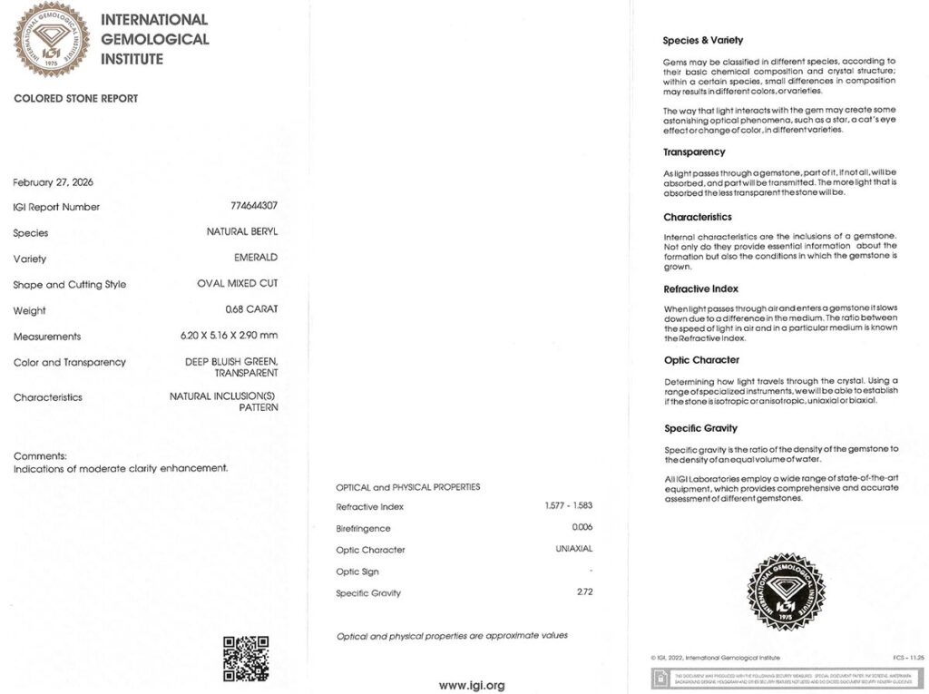 Kámen je včetně mezinárodně uznávaného certifikátu IGI a je zataven do ochranného pouzdra. Průhlednost smaragdu byla upravena bezbarvým olejem (jedná se o běžnou úpravu).