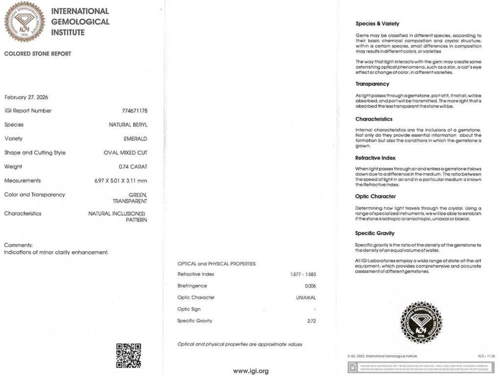 Kámen je včetně mezinárodně uznávaného certifikátu IGI a je zataven do ochranného pouzdra. Průhlednost smaragdu byla upravena bezbarvým olejem (jedná se o běžnou úpravu).