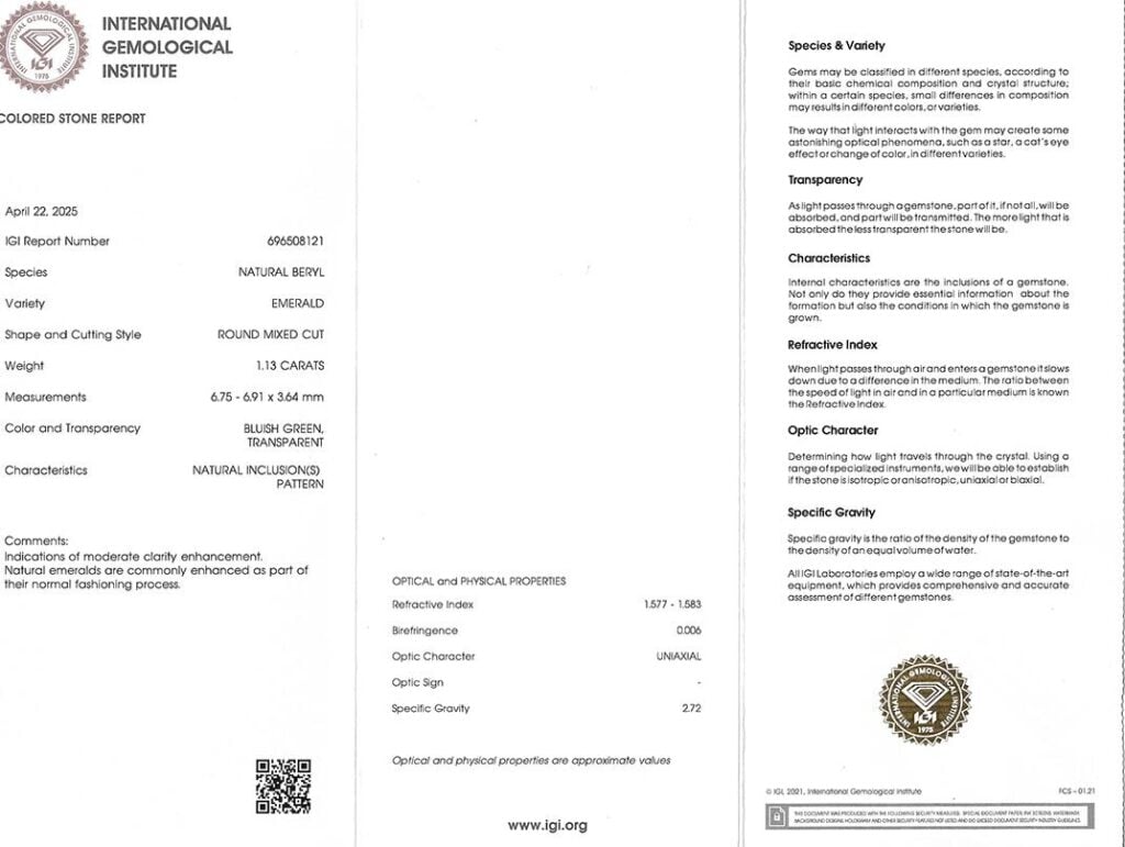 Kámen je včetně mezinárodně uznávaného certifikátu IGI a je zataven do ochranného pouzdra. Průhlednost smaragdu byla upravena bezbarvým olejem (jedná se o běžnou úpravu).