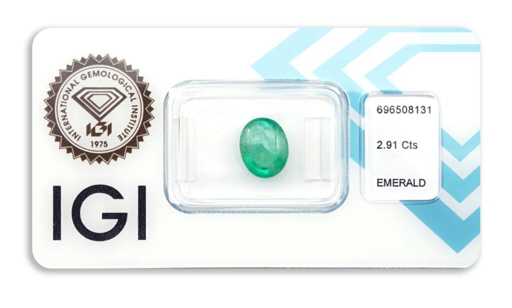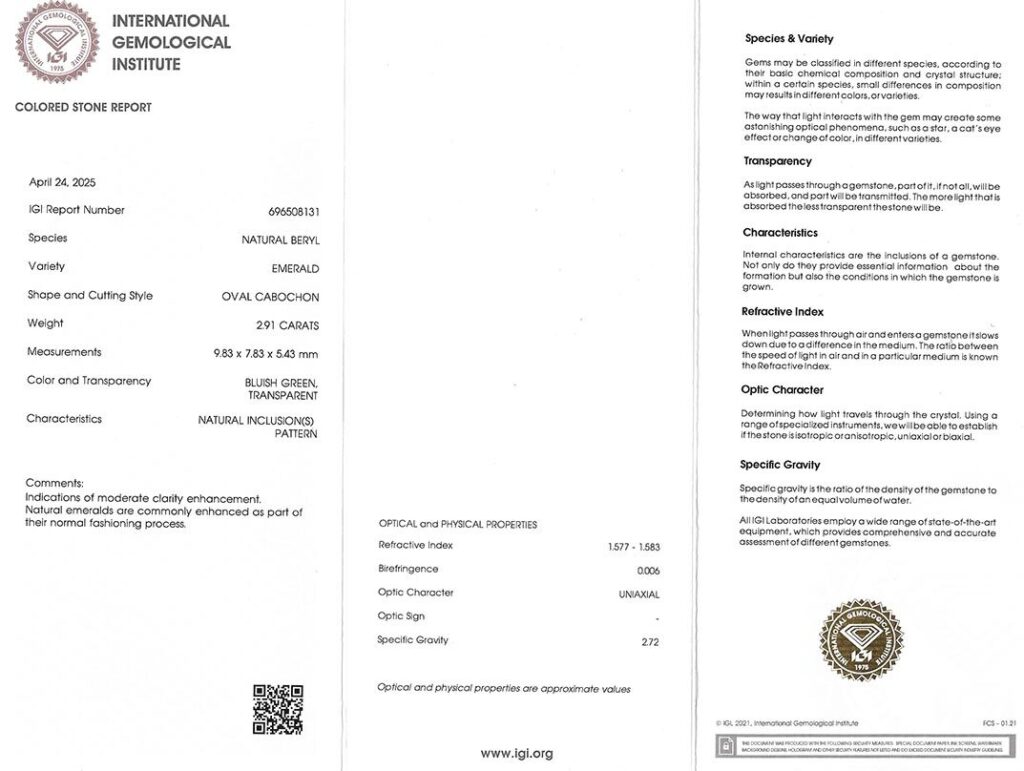 Kámen je včetně mezinárodně uznávaného certifikátu IGI a je zataven do ochranného pouzdra. Průhlednost smaragdu byla upravena bezbarvým olejem (jedná se o běžnou úpravu).
