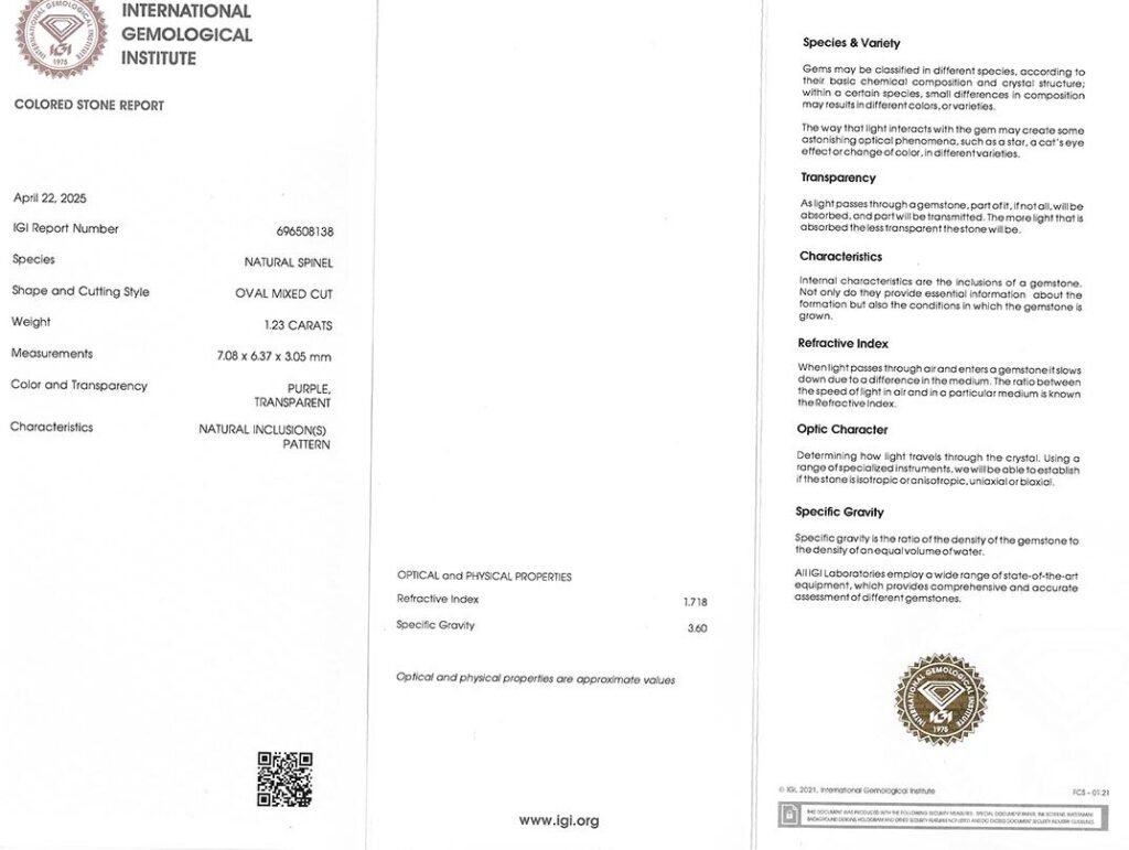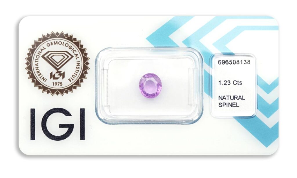 spinel 1.23ct purple s IGI certifikátem