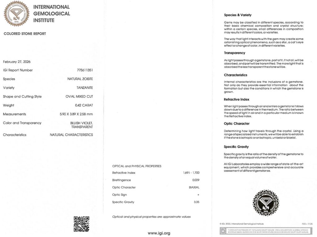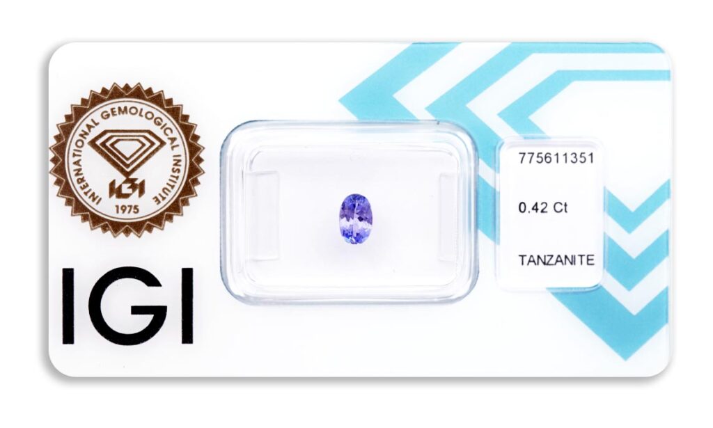Kámen je včetně mezinárodně uznávaného certifikátu IGI a je zataven do ochranného pouzdra. Tanzanity jsou běžně tepelně vylepšovány; indikativní důkaz o úpravě obvykle chybí.