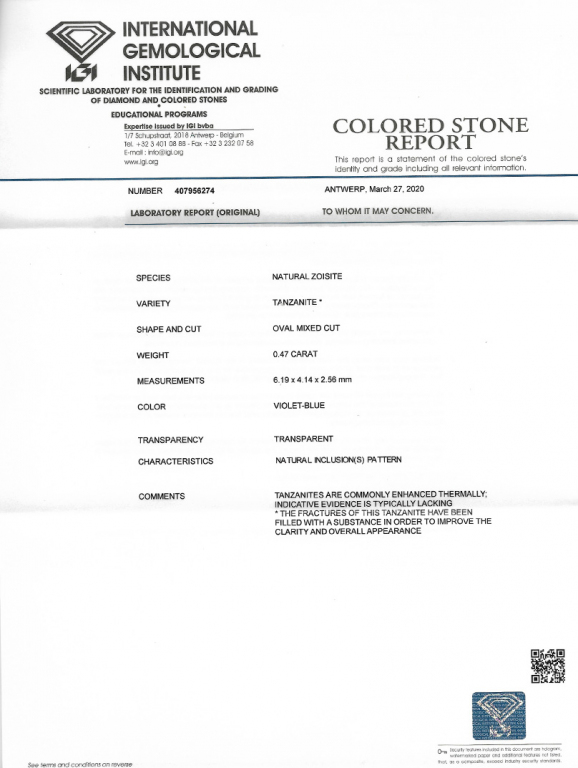 Kámen je včetně mezinárodně uznávaného certifikátu IGI a je zataven do ochranného pouzdra. Tanzanity jsou běžně tepelně vylepšovány; indikativní důkaz o úpravě obvykle chybí. Inkluze tohoto tanzanitu byly vyplněny speciální látkou, za účelem zlepšení čistoty a celkového vzhledu.