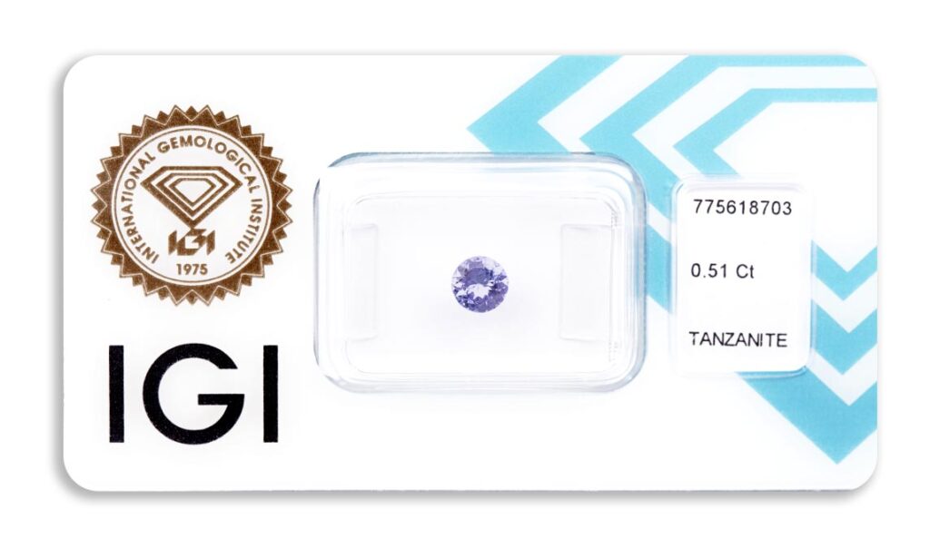 Kámen je včetně mezinárodně uznávaného certifikátu IGI a je zataven do ochranného pouzdra. Tanzanity jsou běžně tepelně vylepšovány; indikativní důkaz o úpravě obvykle chybí.