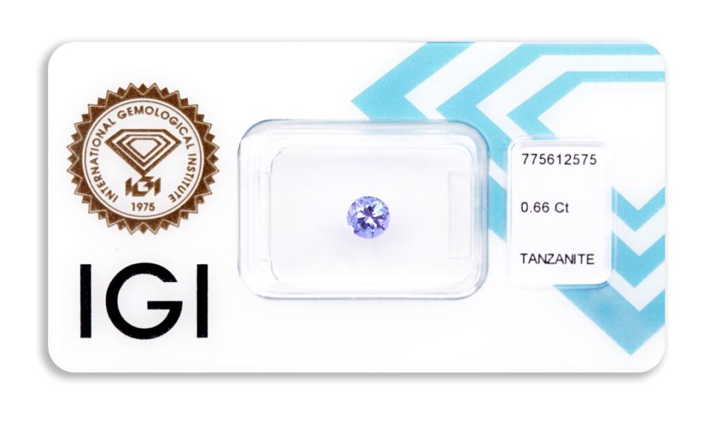 Kámen je včetně mezinárodně uznávaného certifikátu IGI a je zataven do ochranného pouzdra. Tanzanity jsou běžně tepelně vylepšovány; indikativní důkaz o úpravě obvykle chybí.