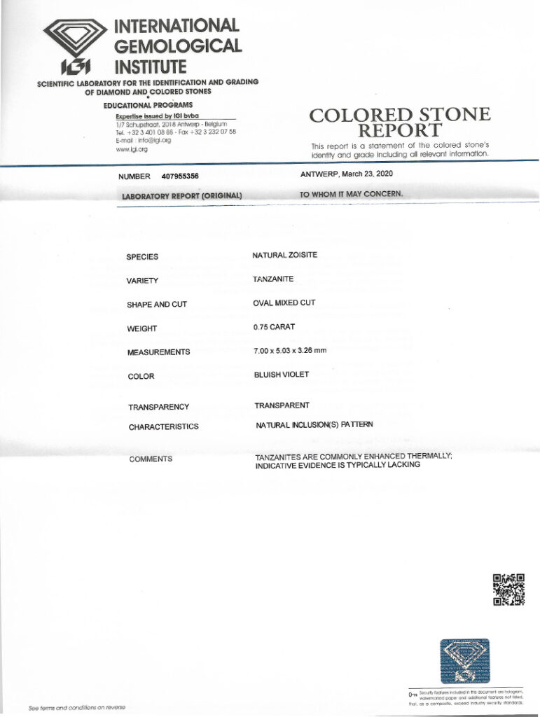 Kámen je včetně mezinárodně uznávaného certifikátu IGI a je zataven do ochranného pouzdra. Tanzanity jsou běžně tepelně vylepšovány; indikativní důkaz o úpravě obvykle chybí.